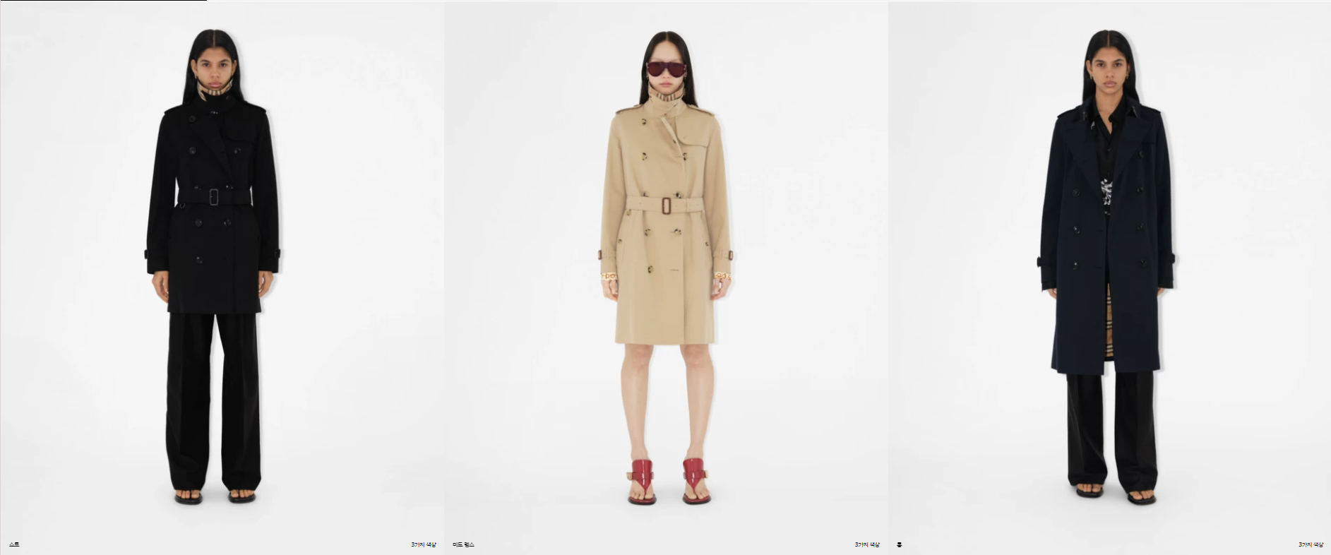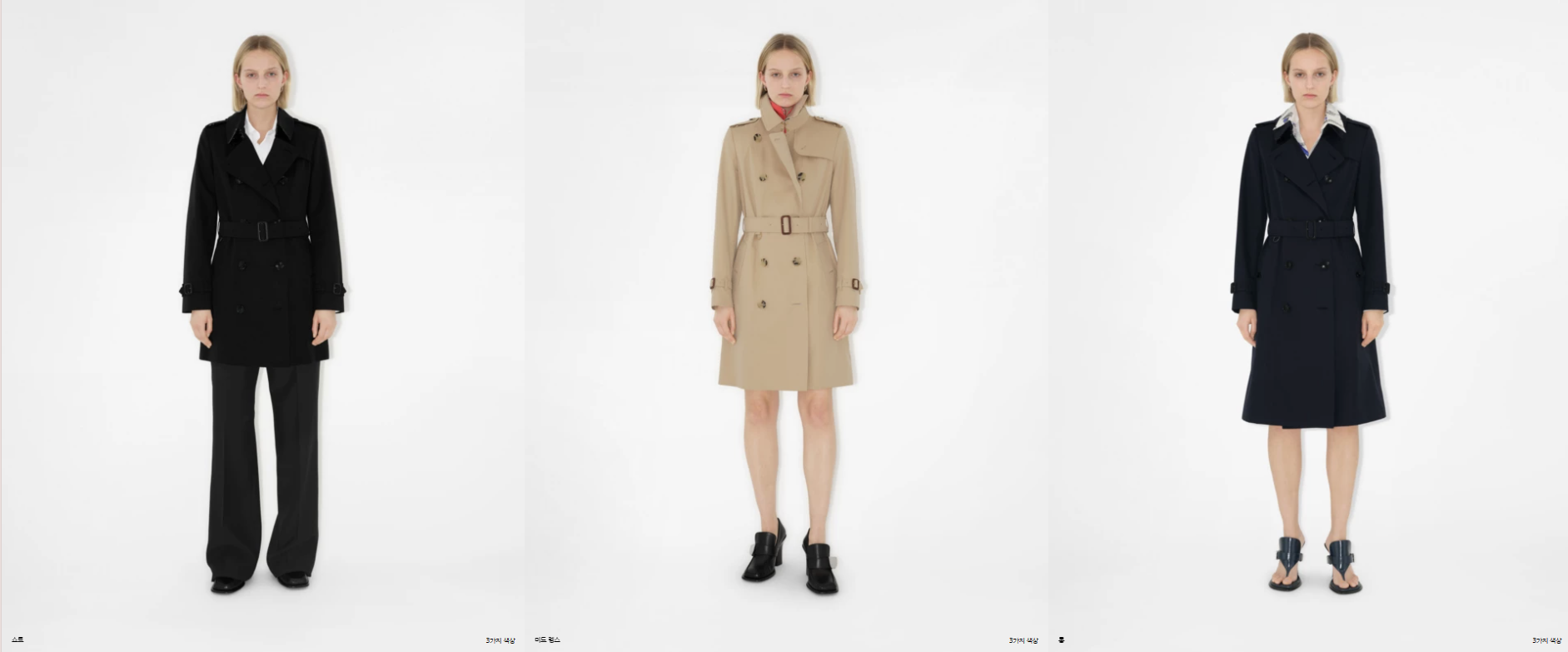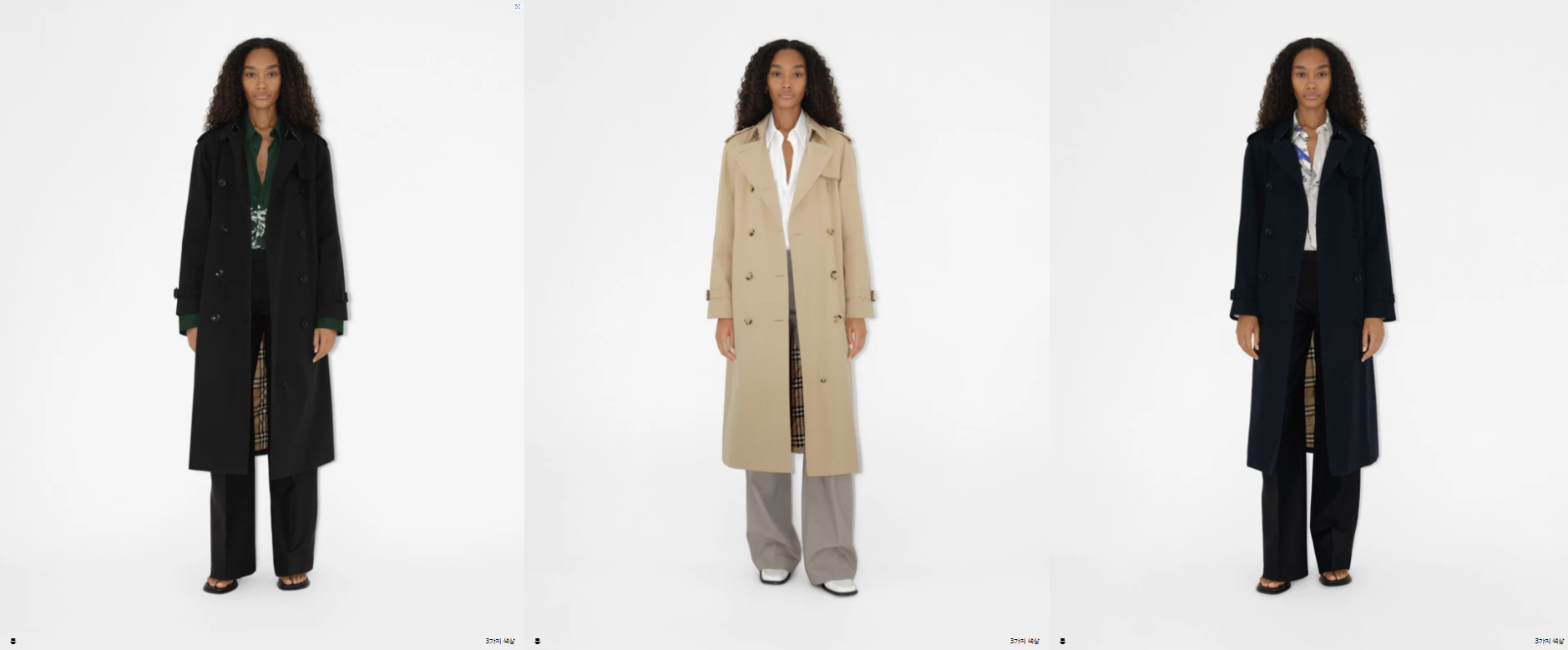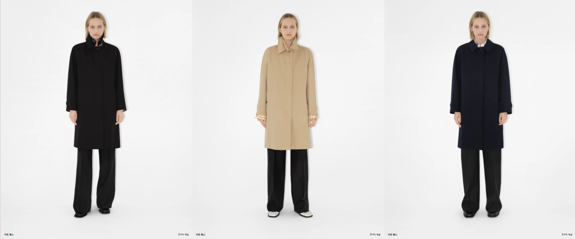 버버리 트렌치코트는 헤리티지 트렌치코트와 그냥 트렌치코트로 나뉩니다. 그리고 헤리티지 트렌치코트 안에는 첼시, 켄싱턴, 워털루 라는 제품이 있고, 그 제품들은 코트의 길이에 따라 한 번 더 나눌 수 있습니다. 그냥 트렌치코트는 시즌제품으로 버버리의 디자이너에 따라, 혹은 계절에 따라, 그 시기 유행에 따라 다양한 제품이 출시되고 있습니다.